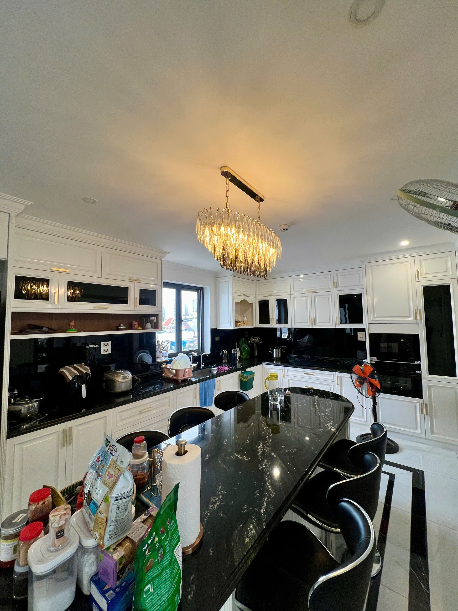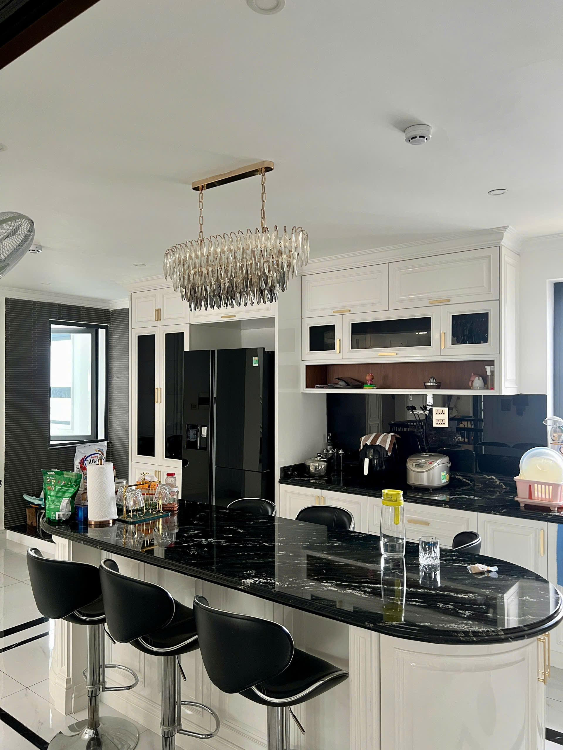 Kết hợp với đèn chùm trần: Để tăng tính thẩm mỹ và ánh sáng cho căn bếp, bạn có thể kết hợp đèn chùm trần. Đèn chùm trần mang lại ánh sáng chung và đồng đều cho căn bếp, trong khi đèn thả phòng bếp tạo điểm nhấn và hiệu ứng ánh sáng riêng biệt.