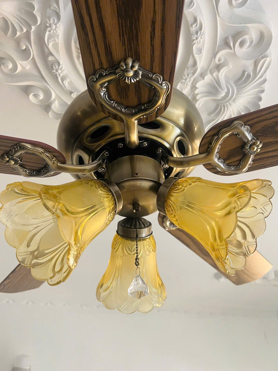 Thân inox, hợp kim cao cấp kết hợp vs cánh kim hoại, giả gỗ, hoặc gỗ tự nhiên. Chao đèn thường được thiết kế bằng chất liệu pha lê, hoặc chao hòa thủy tinh cổ điển.