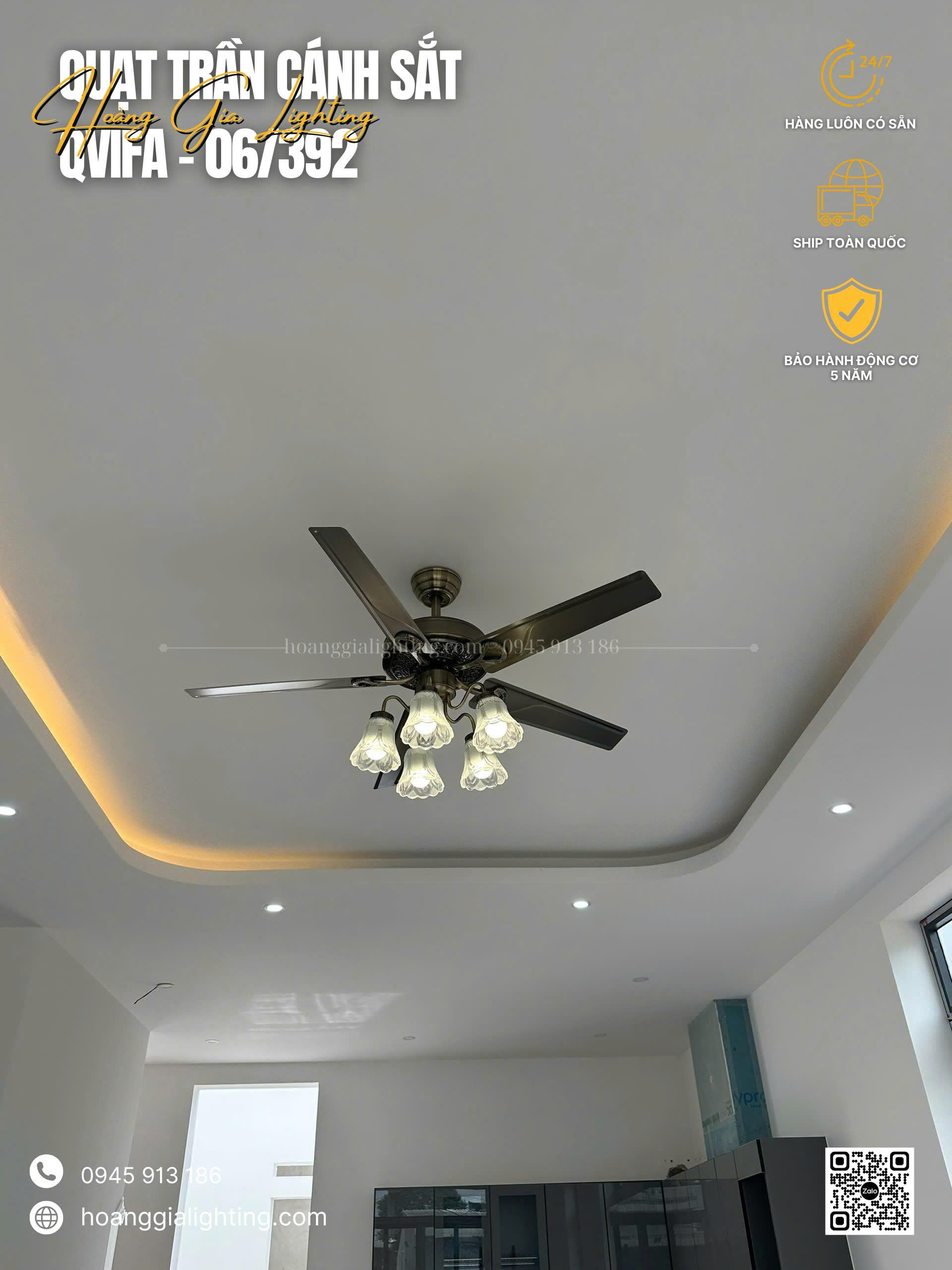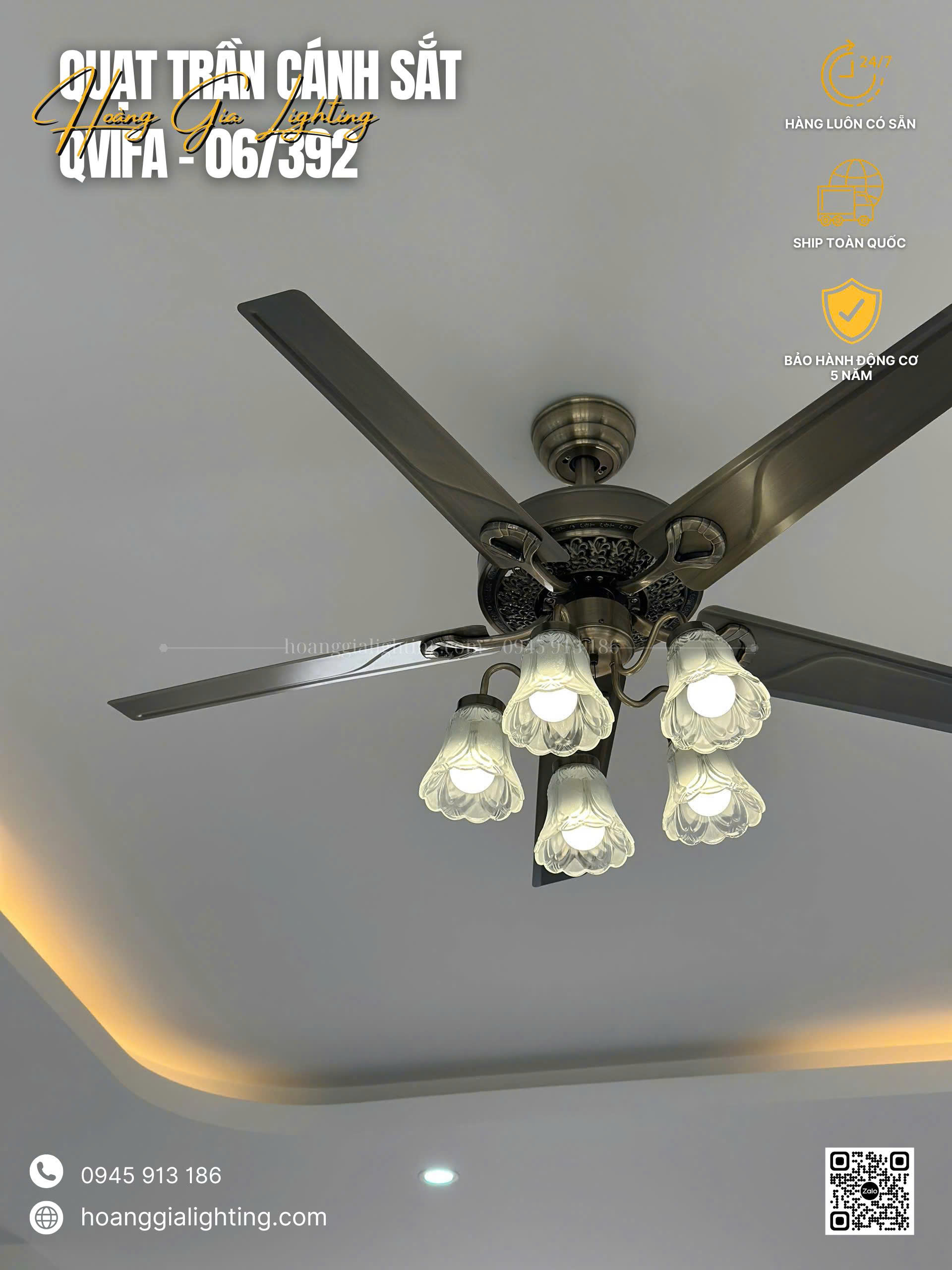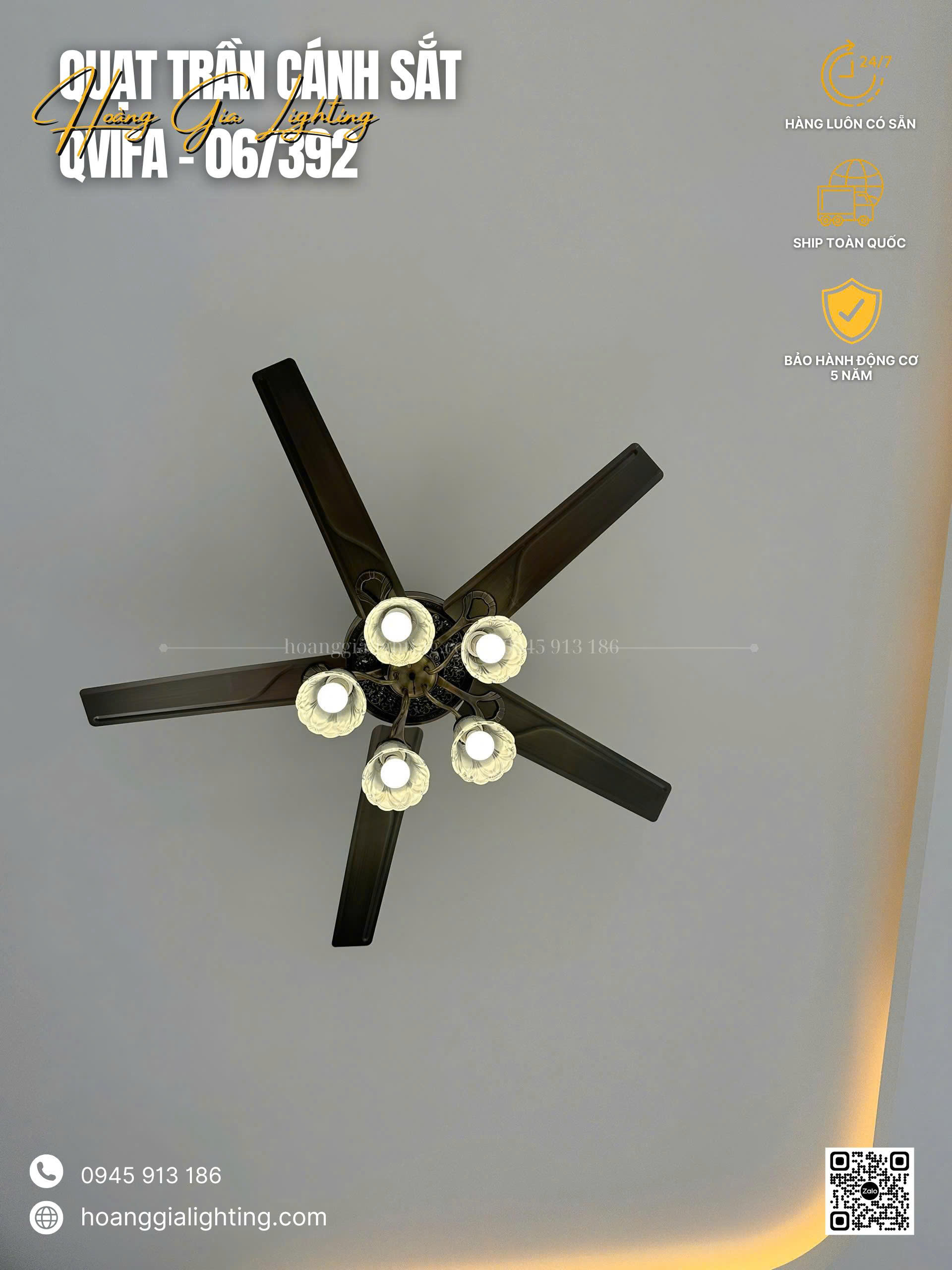 Quạt trần cánh kim loại QViFa-06/392 có cánh nhựa siêu nhẹ siêu bền, dòng quạt trần được thiết kế dành riêng cho quán cafe, khu nghĩ dưỡng, resort.