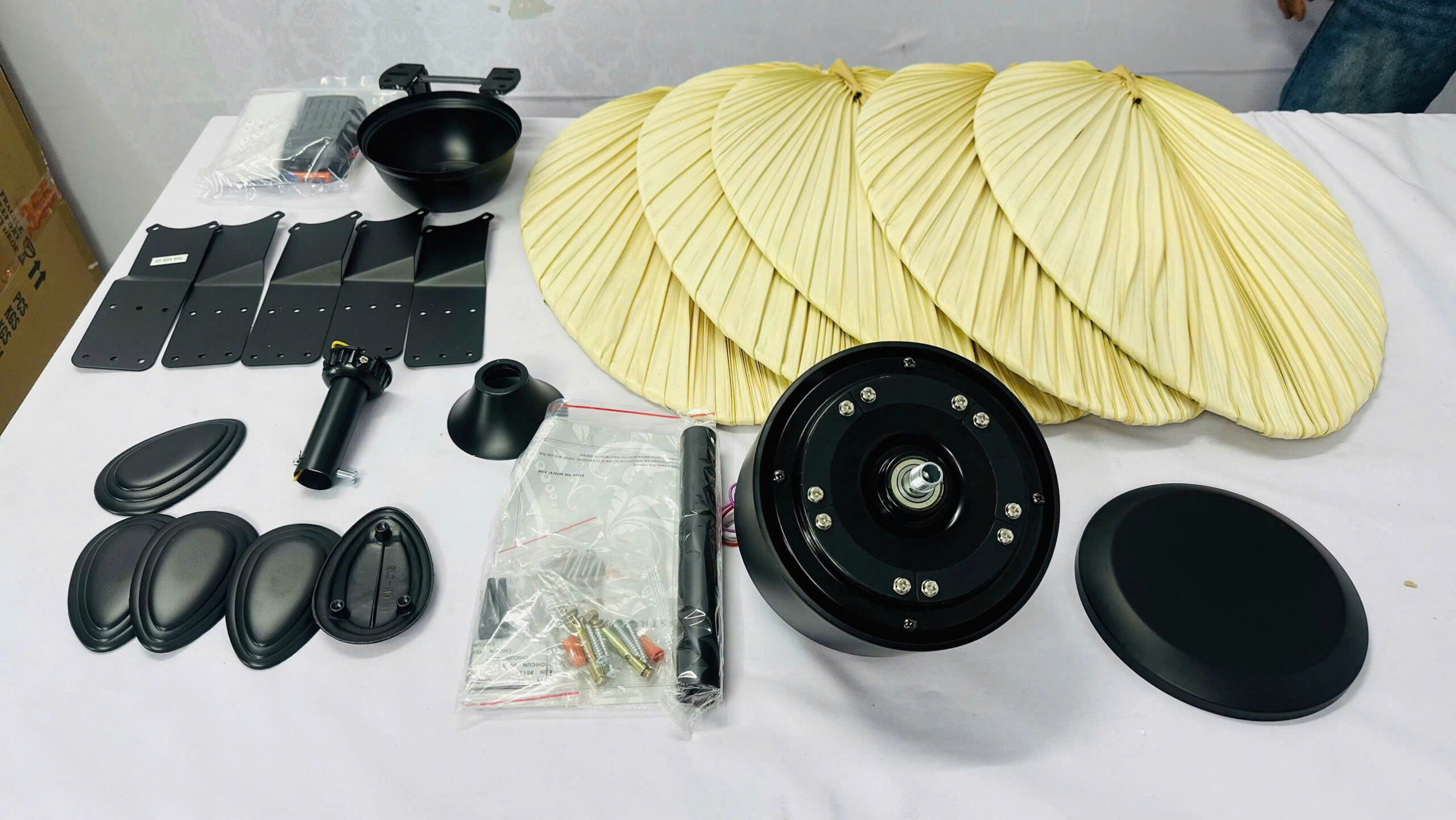 Thân inox, hợp kim cao cấp kết hợp vs cánh kim hoại, giả gỗ, hoặc gỗ tự nhiên. Chao đèn thường được thiết kế bằng chất liệu pha lê, hoặc chao hòa thủy tinh cổ điển.